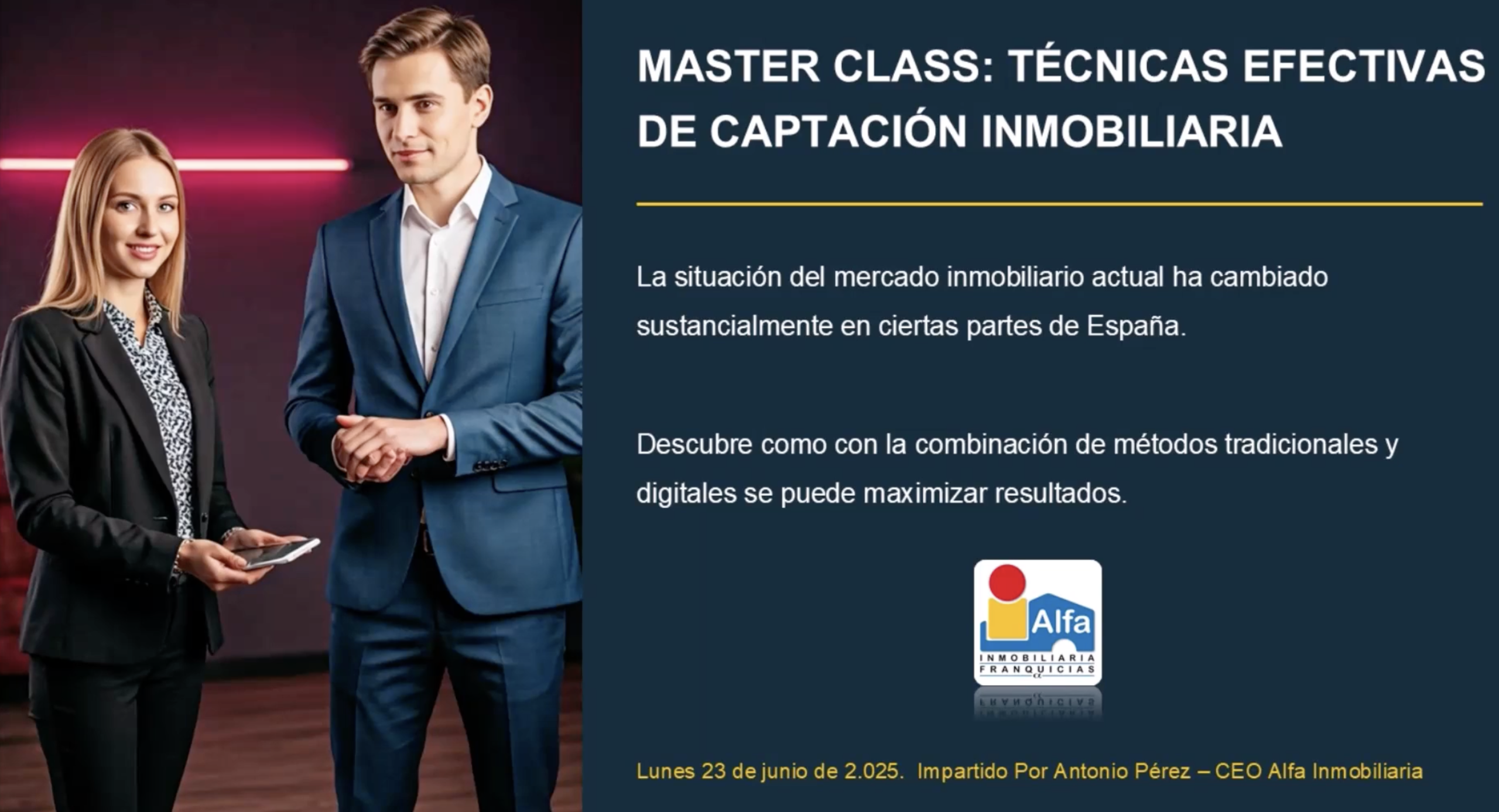 Alfa Inmobiliaria presenta esta nueva Masterclass, donde se analizan Técnicas efectivas de captación inmobiliaria. En esta jornada se explicará de qué forma se podrá captar con diferentes estrategias que permitan poder combinar opciones tradicionales y digitales, para conseguir unos resultados óptimos.